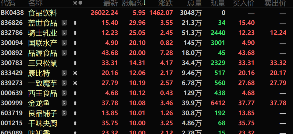 二级市场方面,11月7日食品饮料行业以6.22%的涨幅领跑A股,仅次于非银金融。三全食品、千味央厨、黑芝麻等个股涨停,盖世食品、骑士乳业、国联水产等个股涨幅超20%。食品饮料等大消费板块的大涨,既有业绩支撑的原因,也与市场风格的切换有关。