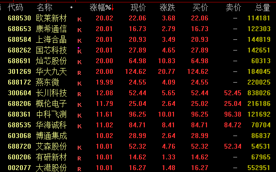 半导体板块盘中强势拉升,截至收盘,欧莱新材、康希通信、上海合晶、国芯科技、灿芯股份、华大九天等20%涨停,概伦电子、中科飞测、华海诚科等涨超10%。