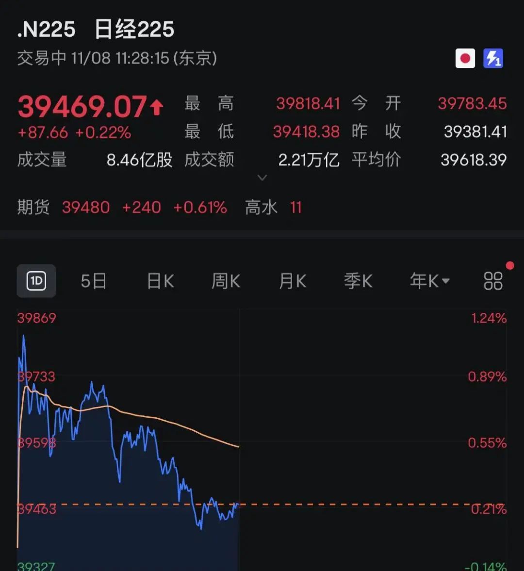 此外,早间高开逾1%的日经指数出现跳水,截至发稿仅涨0.22%。
