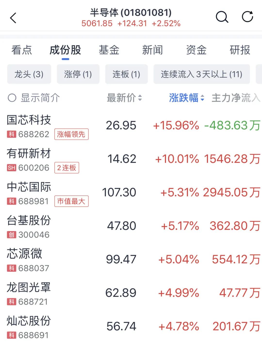 半导体板块亦有不错表现,国芯科技涨近16%,有研新材涨停,中芯国际涨超5%。